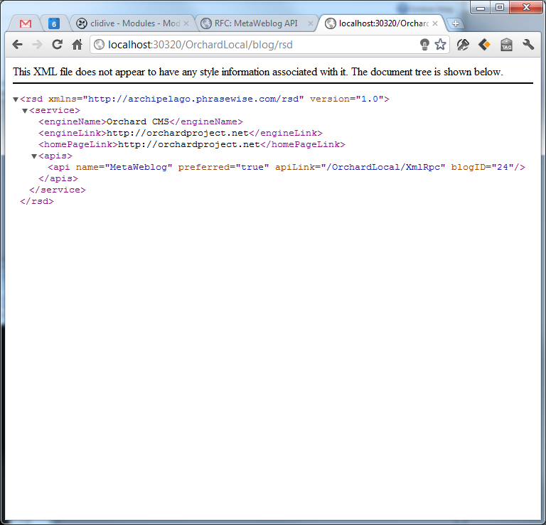 Simple navigate to the following url: http://[path_to_your_blog]/rsd for my local development orchard install that was: http://localhost:30320/OrchardLocal/blog/rsd