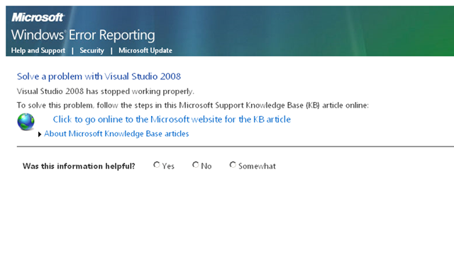 Clicking on this link took you to a rather generic looking Windows Error Reporting page: